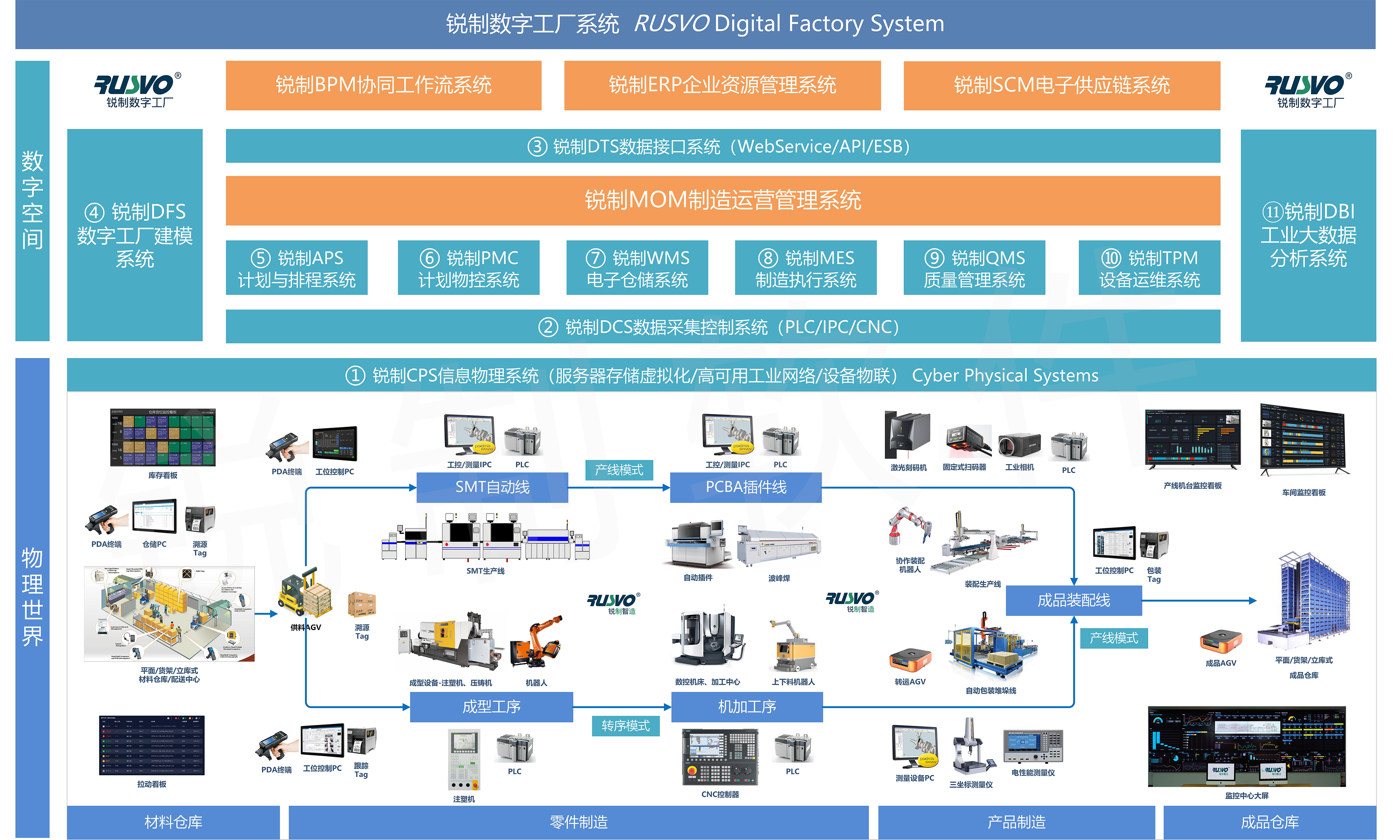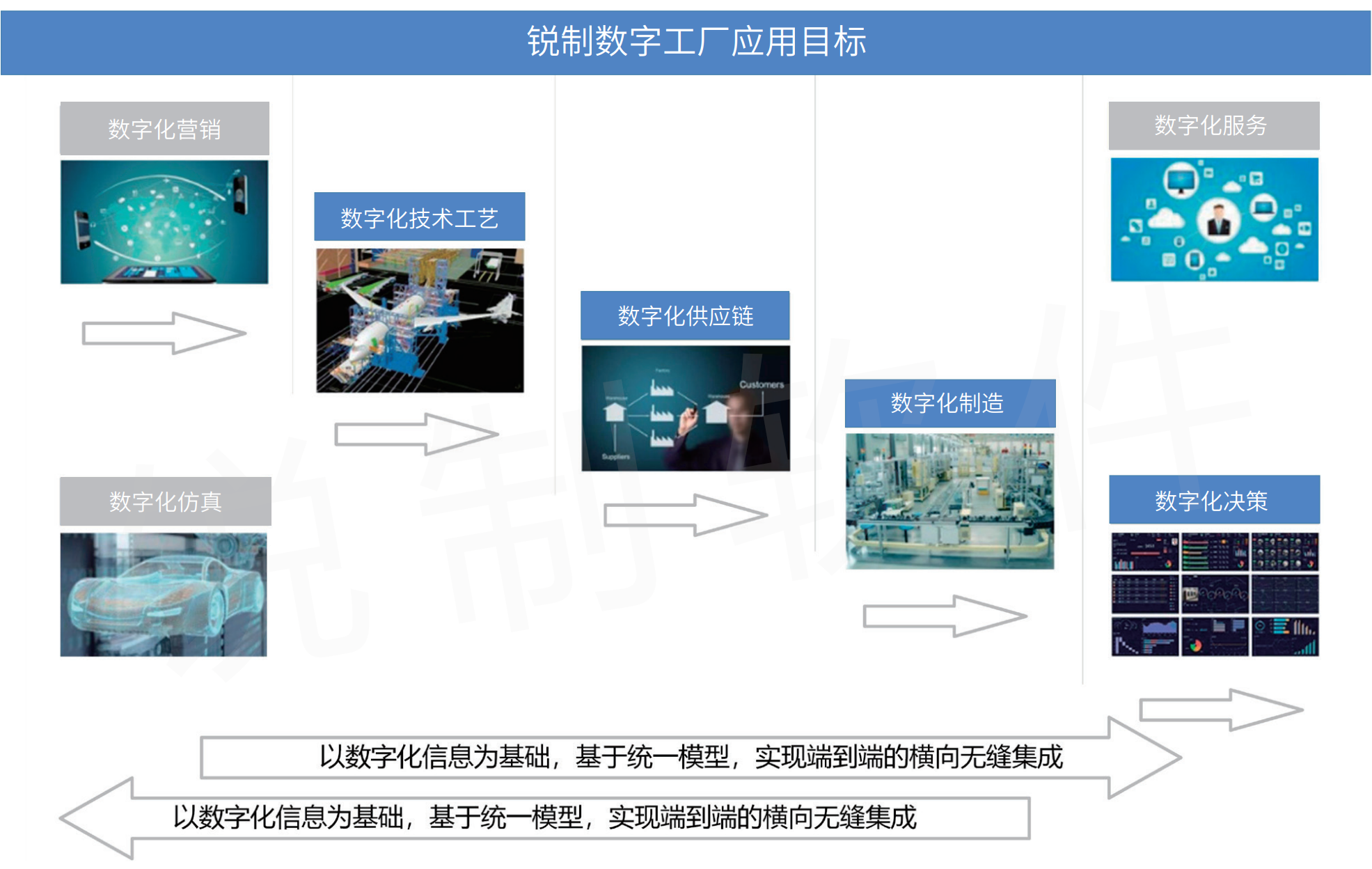 數(shù)字工廠建設(shè)目標(biāo):以數(shù)據(jù)為中心,做到縱向、橫向和端到端的集成,實(shí)現(xiàn)技術(shù)工藝數(shù)字化、生產(chǎn)物流數(shù)字化、生產(chǎn)制造數(shù)字化、決策依據(jù)數(shù)字化四位一體的制造過程控制管理。涵蓋從技術(shù)工藝、生產(chǎn)排程、計(jì)劃物控、材料倉庫、零件制造、產(chǎn)品裝配、成品倉庫的整個(gè)生產(chǎn)制造過程,實(shí)現(xiàn)生產(chǎn)調(diào)度數(shù)字化、生產(chǎn)文檔無紙化、生產(chǎn)數(shù)據(jù)可視化、生產(chǎn)過程透明化、生產(chǎn)決策實(shí)時(shí)化,從而提高生產(chǎn)效率、控制產(chǎn)品質(zhì)量、降低生產(chǎn)成本。以銳制數(shù)字工廠軟件為載體,通過CPS系統(tǒng),實(shí)現(xiàn)與車間生產(chǎn)設(shè)備的互聯(lián)互通,通過主生產(chǎn)計(jì)劃和作業(yè)計(jì)劃制定、現(xiàn)場控制和調(diào)度執(zhí)行、現(xiàn)場數(shù)據(jù)采集、現(xiàn)場質(zhì)量控制、現(xiàn)場預(yù)警及監(jiān)控等模塊,實(shí)現(xiàn)產(chǎn)品制造過程的全面數(shù)字化和可視化。